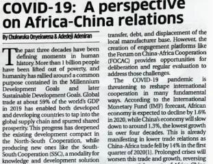 日前,尼日利亞非洲經濟研究*主任奧耶坤納在尼主流媒體《每日信報》發(fā)表題為《新冠肺炎疫情:透視非中關系》的評論文章,認為非中關系平等互利,講求協(xié)調性而非競爭性,是南南合作的典范。面對新冠肺炎疫情,非中雙方需加強團結合作抗疫,努力恢復經濟,繼續(xù)維持雙贏態(tài)勢。